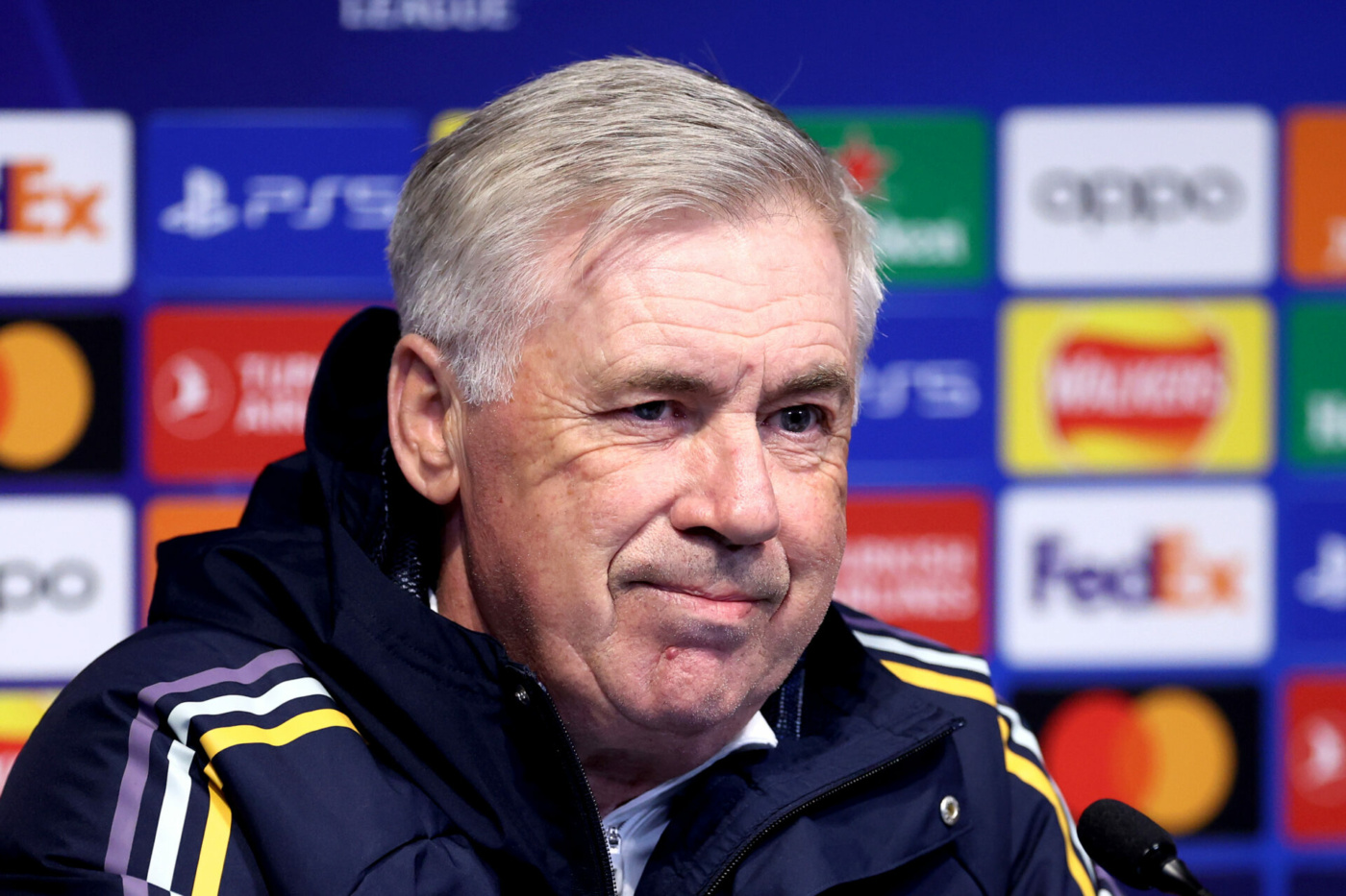 MANCHESTER, ENGLAND - APRIL 16: Carlo Ancelotti, Head Coach of Real Madrid, smiles during a press conference at the Etihad Stadium on April 16, 2024 in Manchester, England. (Photo by Alex Livesey/Getty Images)