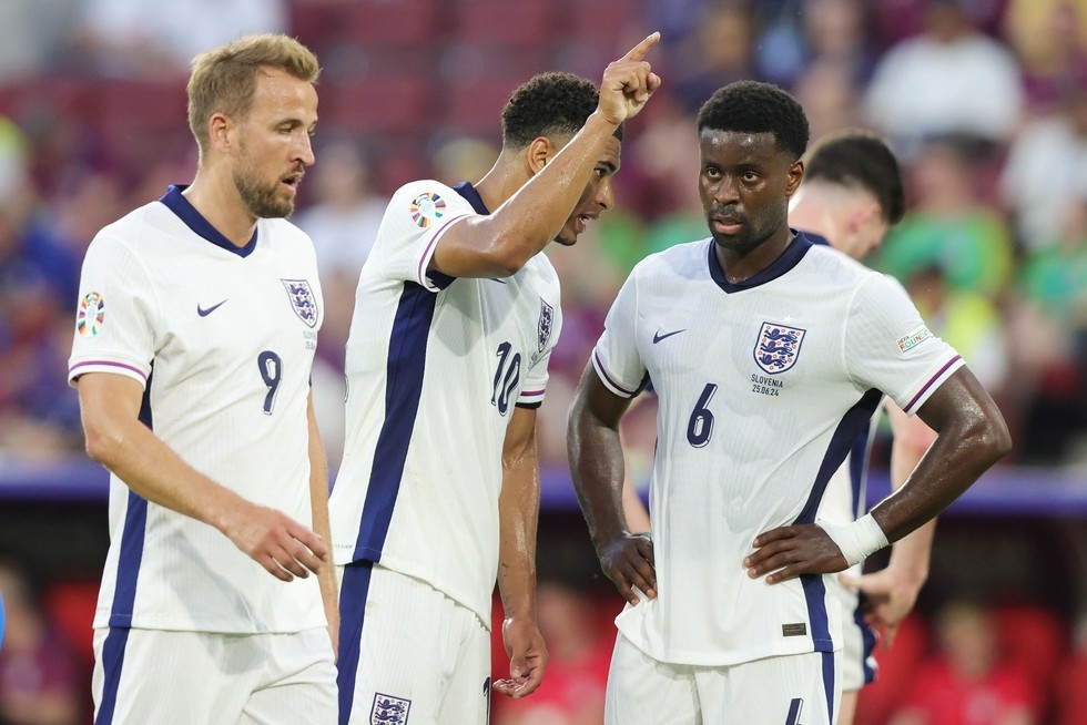 COLOGNE, GERMANY - JUNE 25: Jude Bellingham of England (C), Harry Kane of England and Marc Guehi of England (R) look on during the UEFA EURO 2024 group stage match between England and Slovenia at Cologne Stadium on June 25, 2024 in Cologne, Germany.(Photo by Sebastian El-Saqqa - firo sportphoto/Getty Images)