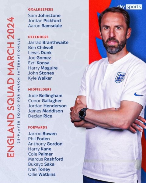 Kombëtarja e Anglisë e ka publikuar listën e futbollistëve të ftuar për ndeshjet miqësore të muajit mars.