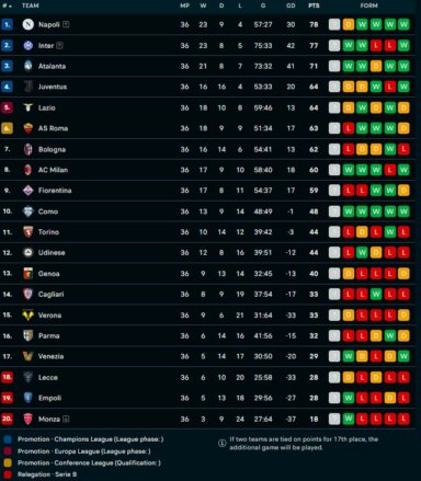 Atalanta tashmë siguron pozitën e tretë pas kësaj fitore dhe ka 71 pikë, kurse Roma mbetet e gjashta me 63 sosh. Romakët me një barazim apo fitore do ta kapnin pozitën e katërt që i dërgonte në Ligën e Kampionëve, por tashmë fati i tyre do të varet edhe nga rezultatet e Juventusit dhe Lazios.
