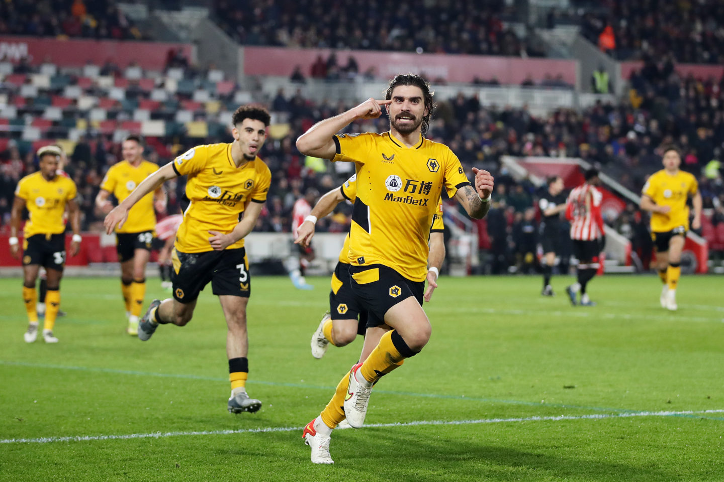 BRENTFORD, ENGLAND - JANUARY 22: Ruben Neves of Wolverhampton Wanderers celebrates after scoring his team's second goal during the Premier League match between Brentford and Wolverhampton Wanderers at Brentford Community Stadium on January 22, 2022 in Brentford, England. (Photo by Jack Thomas - WWFC/Wolves via Getty Images)