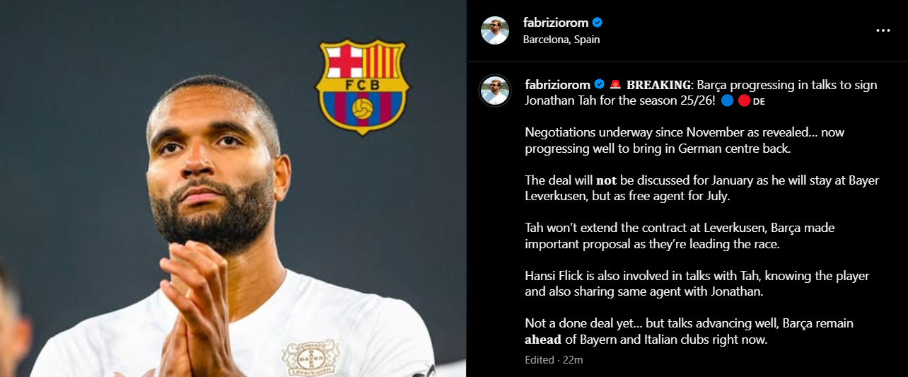Barrcelona po përparon në bisedimet për të nënshkruar me Jonathan Tah për sezonin 2025/26.