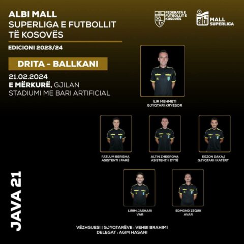 Ilir Mehmeti pritet të drejtoj derbin e kësaj jave Drita-Gjilani, teksa ndihmësit e tij do të jenë Fatlum Berisha dhe Altin Zhegrova.