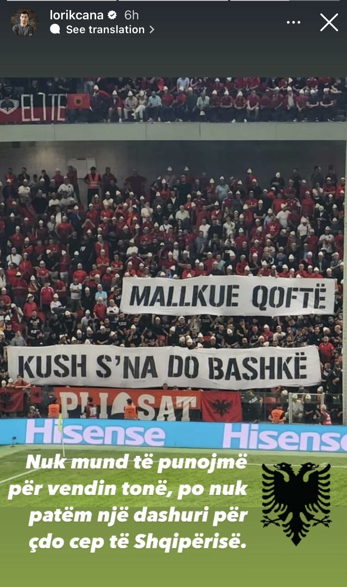 “Nuk mund të punojmë për vendin tonë, po nuk patëm një dashuri për çdo cep të Shqipërisë”, ka shkruar ish kapiteni duke e ndarë fotografinë ku shihet mesazhi i plisave “Mallkue qoftë kush s’na do bashkë”, përcjell Arbresh.info