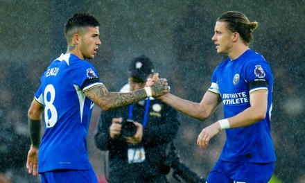 EDITORIAL USE ONLY No use with unauthorised audio, video, data, fixture lists, club/league logos or "live" services. Online in-match use limited to 120 images, no video emulation. No use in betting, games or single club/league/player publications. Mandatory Credit: Photo by Javier Garcia/Shutterstock (14157506cs) Enzo Fernández and Conor Gallagher of Chelsea Chelsea v Arsenal, Premier League, Football, Stamford Bridge, London, UK - 21 Oct 2023