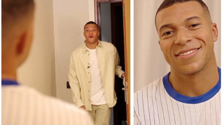 Figura përshkruan Mbappen në stilin e tij të festimit të golit, me duar të ngritura dhe një buzëqeshje në fytyrë, dhe me të parë atë, francezi bërtiti: “Ky jam unë!”.