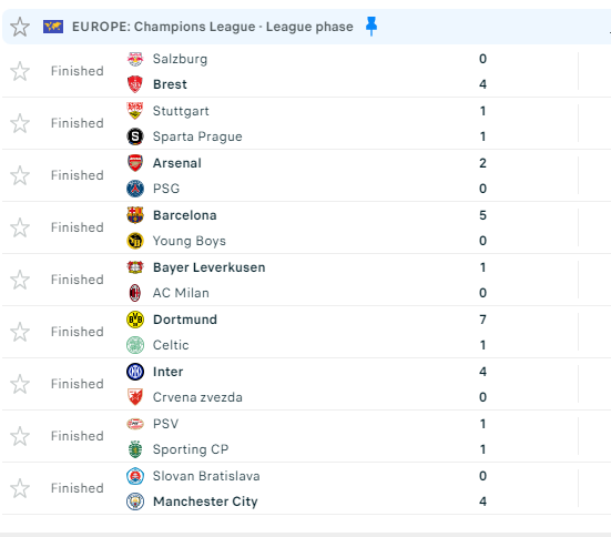 Në ndeshjet e tjera, Arsenal e ka mundur PSG-në me rezultat 2-0, Bayer Leverkusen ka fituar ndaj Milanit me 1-0, Inter ka triumfuar ndaj Crvena Zvezdës me 4-0, ndërsa PSV dhe Sporting kanë barazuar 1-1./rtk