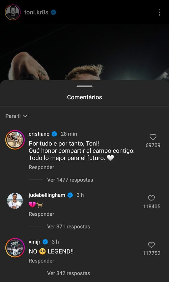 “Për gjithçka dhe për kaq shumë, Toni! Çfarë nderi që kam ndarë fushën me ju. Gjithë të mirat për të ardhmen”, ka shkruar kapiteni i skuadrës portugeze në postimin e Kroos në Instagram.