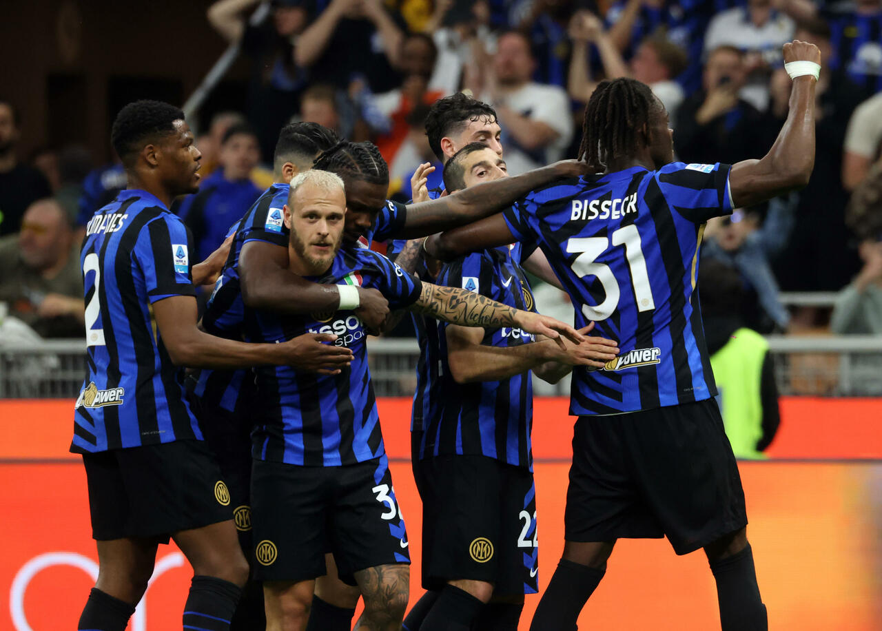 Inter Milans Yann Bisseck (R) jubilates with his teammates after scoring goal of 1 to 0 during the Italian serie A soccer match between Inter and Lazio at Giuseppe Meazza stadium in Milan, 18 May 2025. ANSA / MATTEO BAZZI