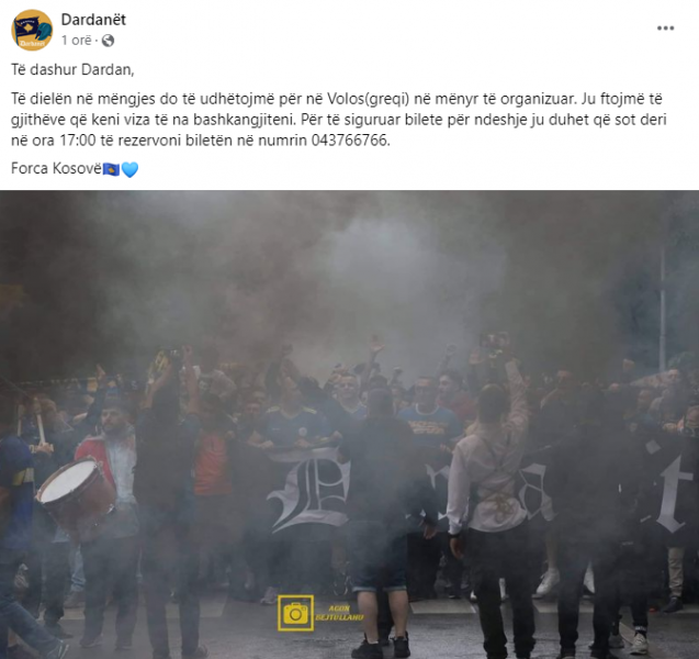 “Të dielën në mëngjes do të udhëtojmë për në Volos(greqi) në mënyr të organizuar. Ju ftojmë të gjithëve që keni viza të na bashkangjiteni. Për të siguruar bilete për ndeshje ju duhet që sot deri në ora 17:00 të rezervoni biletën në numrin 043766766”, thuhej në njoftimin e tyre./arbresh.info/