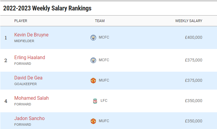 Kevin de Bruyne aktualisht cilësohet si lojtari më i paguar në Ligën Premier nga ky ueb sajt, pasi belgu te Manchester City fiton mbi 450 mijë euro (400,000 pound).
