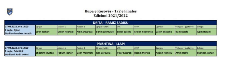 Takimi tjetër do të jetë mes Dritës dhe Ramiz Sadikut, që do të zhvillohet në Gjilan. Për këto dy ndeshje janë deleguar gjyqtarët të cilët do t’i gjykojnë gjysmëfinalet e para.