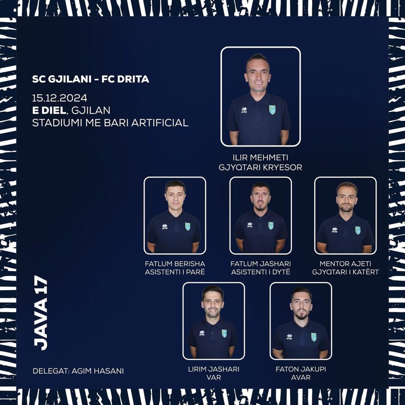 Ilir Mehmeti do të jetë gjyqtar kryesor. Ndërsa asistentët e tij do të jenë Fatlum Berisha dhe Fatlum Jashari. Kurse gjqytar i katërt do të jetë Mentor Ajeti.