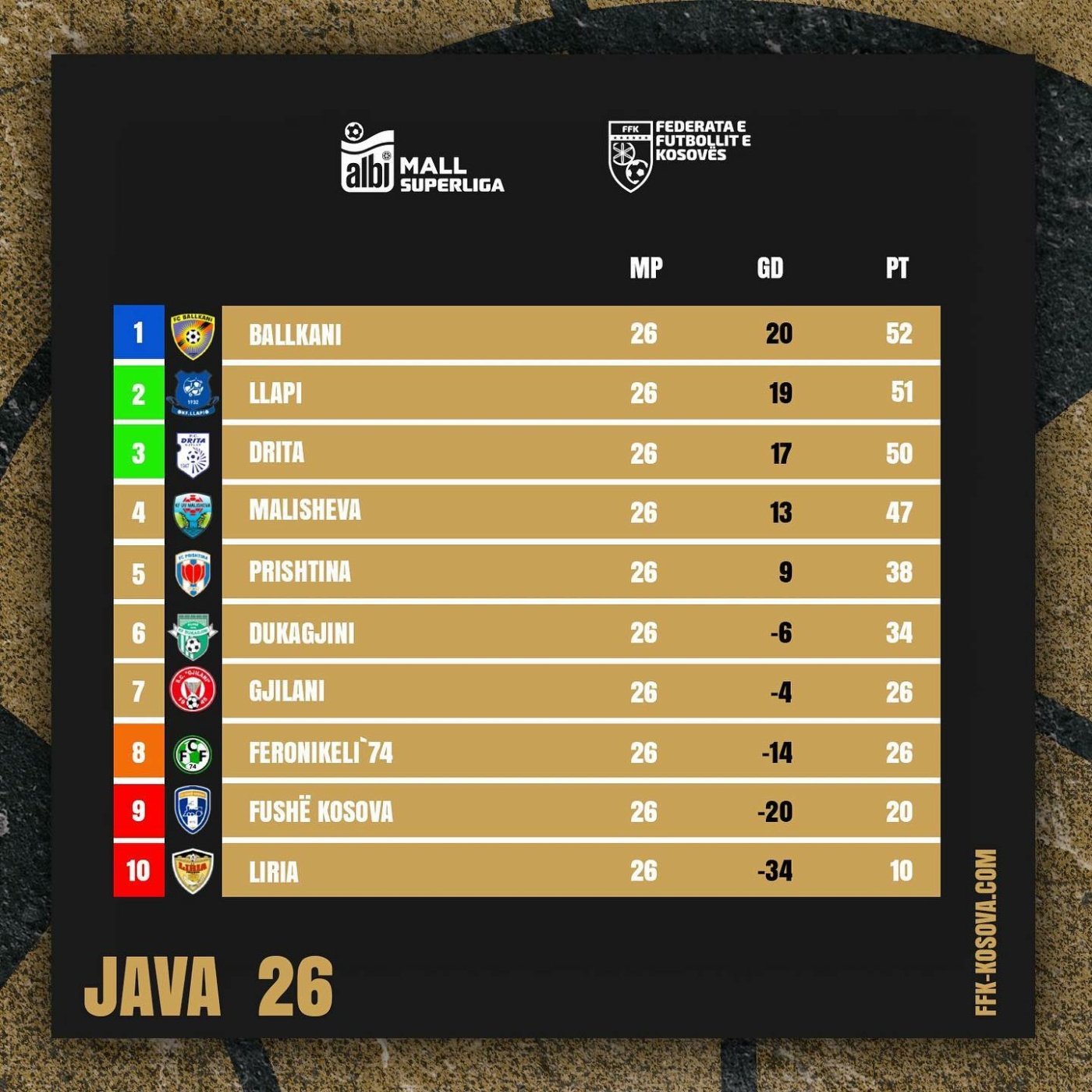 Ballkani mbetet lider me 52 pikë, kur kanë mbetur edhe dhjetë ndeshje deri në fund. Llapi mbetet i dyti me 51 pikë, ndërsa Drita është e treta me 50 pikë.