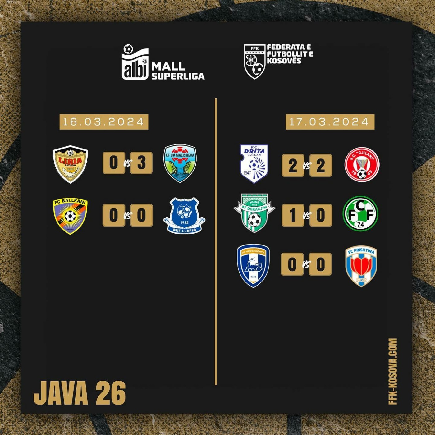 Në javën e ardhme, atë të 27-të luajnë: Prishtina – Ballkani, Llapi – Liria, Malisheva – Drita, Gjilani – Dukagjini, Feronikeli – Fushë Kosova. /Telegrafi/