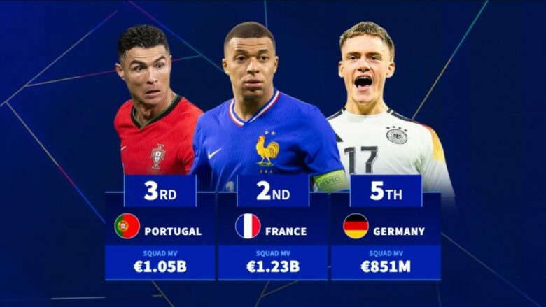 Franca renditet e dyta për skuadrat më të vlefshme në Euro 2024 me Mbappen lojtarin e tyre më të vlefshëm me 180 milionë euro.