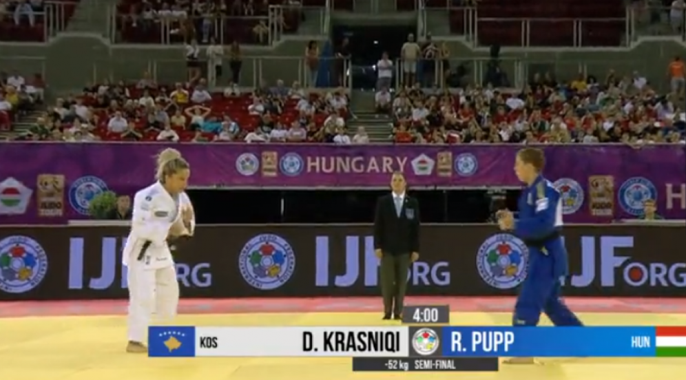 Xhudisjta në gjysmëfinale u përballë me hungarezen, Reka Pupp në kategorinë deri në 52 kilogramë.