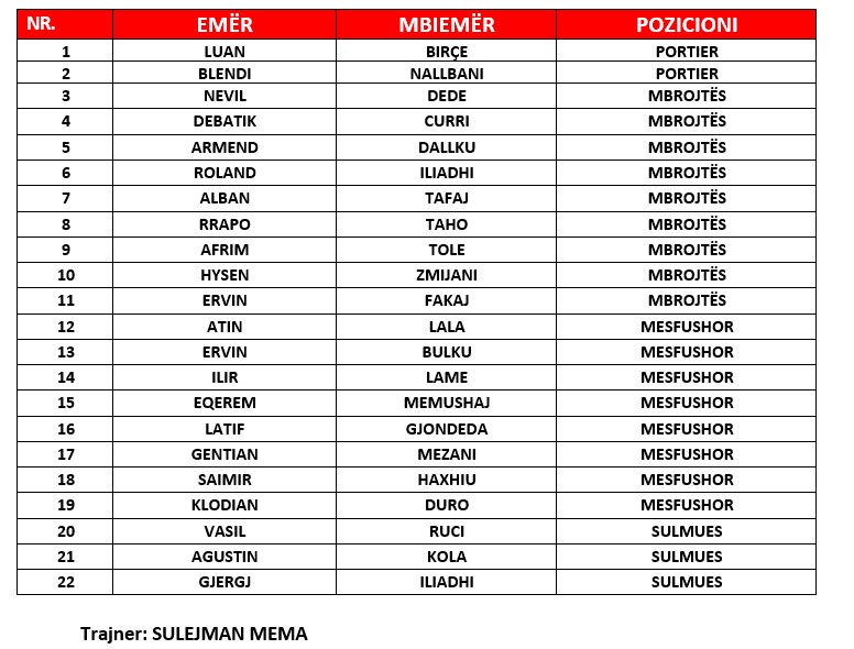 Ndërkaq, Departamenti i Ekipeve Kombëtare në FSHF ka përgatitur edhe listën e lojtarëve që janë thirrur për këtë miqësore me ish-trajnerin e mirënjohur Sulejman Mema, i cili është si gjithmonë në rolin e seleksionerit. Bien në sy shumë emra të njohur të Kombëtares dhe futbollit shqiptar ndër vite si Blendi Nallbani, Nevil Dede, Debatik Curri, Armend Dallku, Roland Iliadhi, Alban Tafaj, Rrapo Taho, Afrim Tole, Hysen Zmijani, Ervin Fakaj, Altin Lala, Ervin Bulku, Ilir Lame, Klodian Duro, Agustin Kola dhe të tjerë.