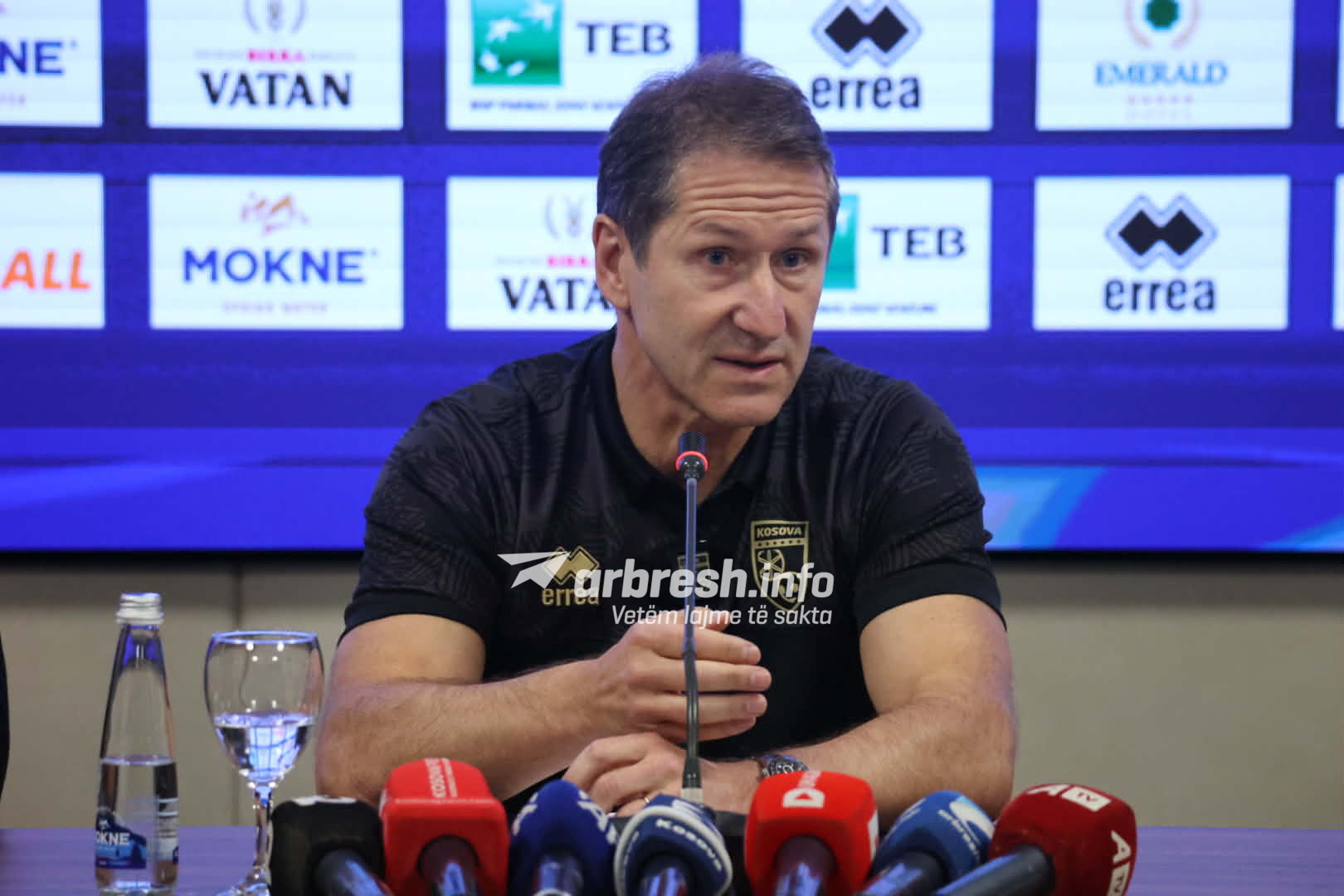 Selektori i Kosovës, Franco Foda është duke mbajtur konferencë e parë për media, disa ditë pasi publikoi listën e lojtarëve të ftuar për ndeshjen jetike ndaj Sllovakisë në kuadër të play-offit për Kupën e Botës.