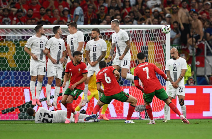 Në minutën e 34-të, Cristiano Ronaldo tentoi nga gjuajtja e lirë, por vetëm shtylla horizontale shpëtoi Slloveninë.