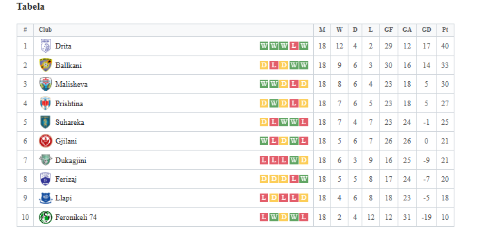 Pas 18 javësh, Drita është në krye të tabelës me 40 pikë dhe e mbyll stinorin vjeshtor si kampione e Kosovës. Ndjekësi i parë i “Intelektualëve” është Ballkani me 33 sosh. Kurse top treshen e mbyll, Malisheva me gjithsej 30 pikë.