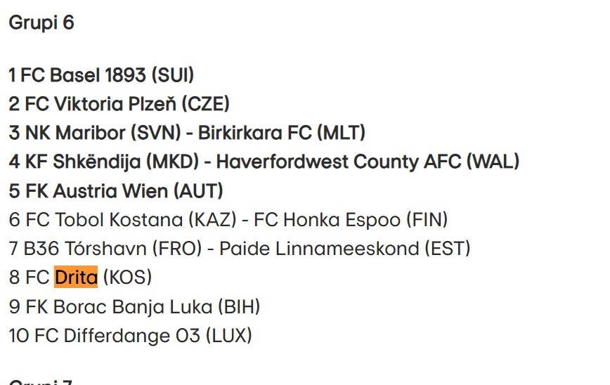Drita ndodhet në Grupin 6 me 10 skuadra, ku pesë prej tyre janë kundërshtarët e mundshëm të gjilanasve.