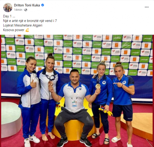 Dita 1. Një e artë, një e bronztë, një vend i shtatë. Lojërat Mesdhetare Algjeri .Kosova power”, shkroi Kuka.