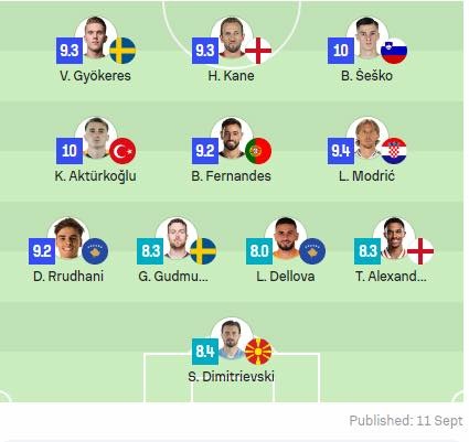 Në formacionin e javës krah me dy yjet kosovar ishin edhe super emëra botëror si Luka Modric, Harry Kane, Bruno Fernandes, Alexander-Arnold.