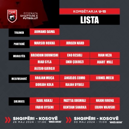 Më poshtë edhe lista me emrat e 20 lojtarëve të ftuar për dy miqësoret ndaj Kosovës U-15: