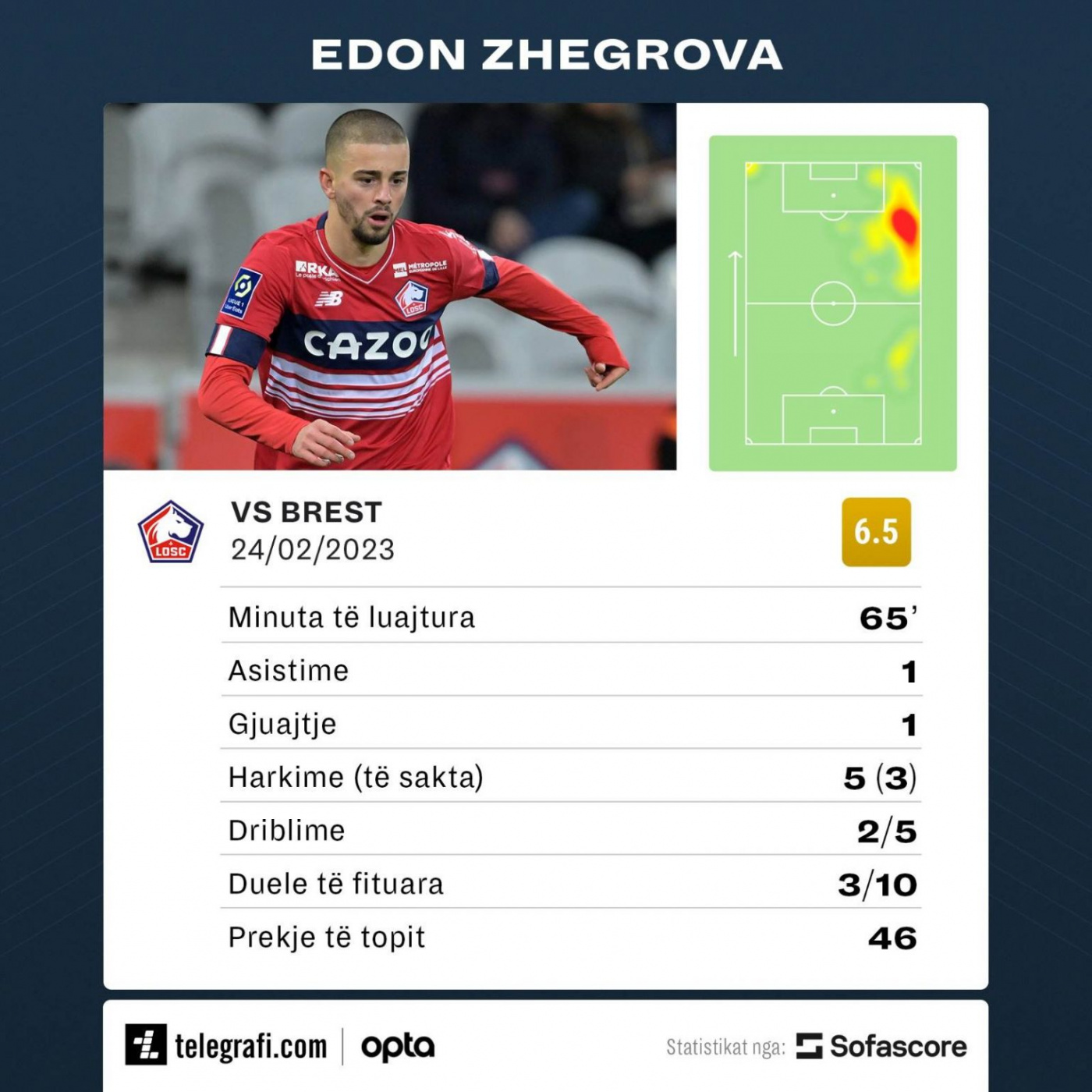 Edon Zhegrova ka vazhduar formën e mirë me Lille, ku ka asistuar ndaj Brestit, në kuadër të xhiros së 25-të të Ligue 1.