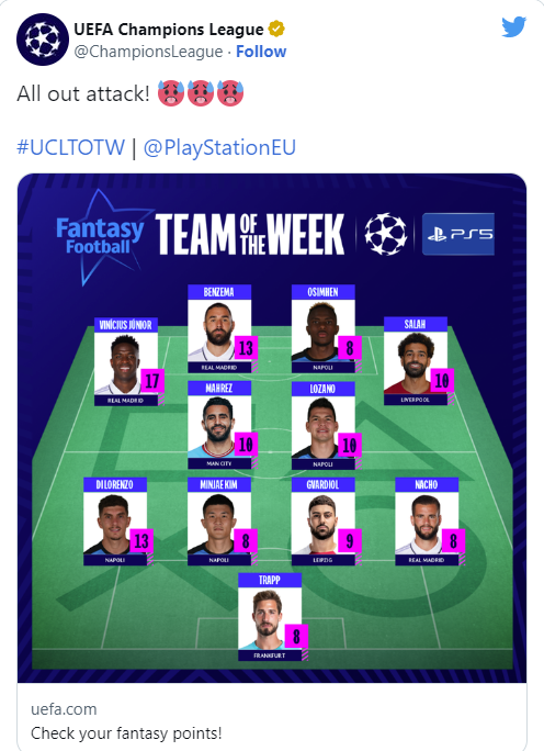 Napoli me katër dhe Real Madridi me tre janë dy skuadrat me më shumë lojtarë të zgjedhur në “formacionin e javës”.