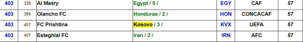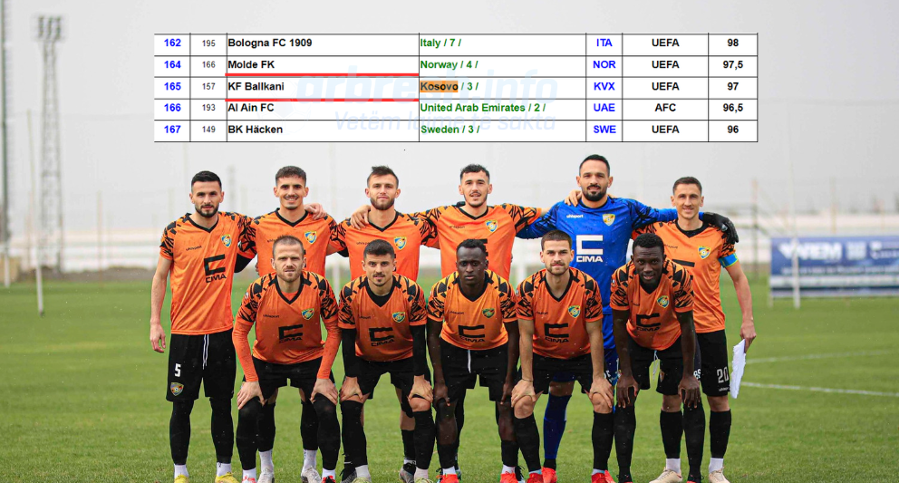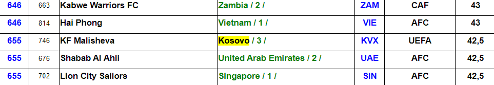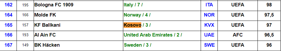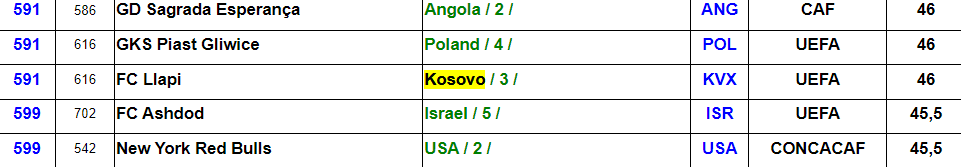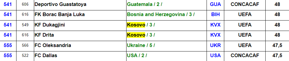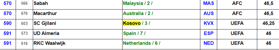 Në këtë listë janë të përfshirë edhe 7 skuadra kosovare ato janë FC Ballkani, FC Prishtina KF Dukagjini, FC Drita, SC Gjilani, FC Llapi dhe FC Maliseva, shkruan Arbresh.info.