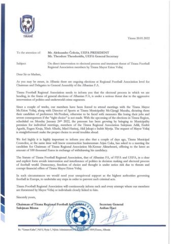 “Ky veprim është në vazhdën e presioneve politike që po ushtrohen mbi anëtarët tanë dhe ky presion politik nuk është askund tjetër më i qartë dhe më i pastër se sa në kryeqytet, ku anëtarët e Shoqatës Rajonale të Futbollit thirren sistematikisht nëpër zyrat e shtetit e të bashkisë, ku i bëhet presion se po nuk mbështetën kandidatit e përzgjedhur prej tyre do të largohen nga puna. Këto takime janë përshkruar nga ata që kanë marrë pjesë si thirrje në hetuesinë e dikurshme, ku lihen njerëzit të presin me orë të tëra në mungesë komunikimi me jashtë në një gjendje të rënduar presioni psikologjik. SHRF Tiranë ka njoftuar UEFA-në dhe FIFA-në për të gjitha veprimet që janë duke ndodhur, disa prej tyre janë edhe të provuara përmes pamjeve filmike dhe këto veprime janë raportuar në organizmat ndërkombëtare dhe nga SHRF Tiranë është kërkuar ndihmë. Dua të siguroj çdo anëtar të FSHF-së se është detyrë statutore e Federatës që t’i mbrojë anëtarët e saj nga çdo ndërhyrje të papërshtatshme, aq më tepër nga çdo ndërhyrje politike. I ftoj të gjithë të jenë të qetë në veprimet e tyre, të mos ndikohen nga këto vendime politike dhe të vazhdojnë rrugën e tyre për zhvillimin e futbollit në Shqipëri”, – theksoi Drejtori i Departamentit Ligjor dhe Licencimit.