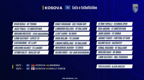 Përzgjedhësi i Përfaqësueses së Kosovës, Alain Giresse, ka publikuar listën e futbollistëve për dy miqësoret e këtij muaji, kundër Armenisë, më 16 nëntor dhe kundër Ishujve Faroe, më 19 nëntor.