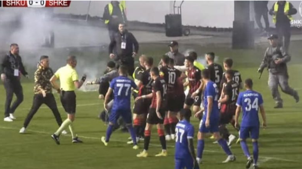 E gjitha erdhi pasi tifozët vendas, ata të Shkupit, pushtuan fushën në tentim për t’i qëruar hesapet me futbollistët e Shkëndijës, të cilët po festonin golin e epërsinë 0-1.