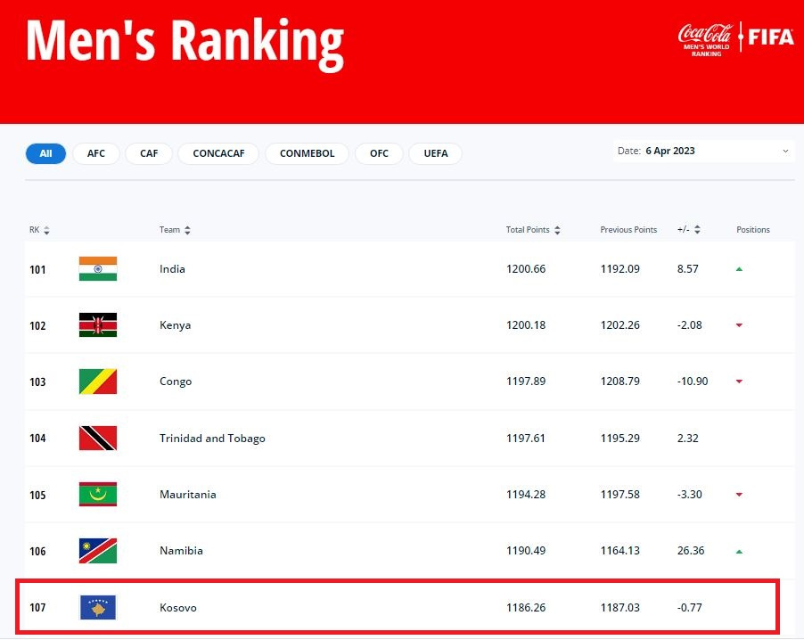 FIFA ka publikuar rënditjen e kombëtareve për muajin prill.