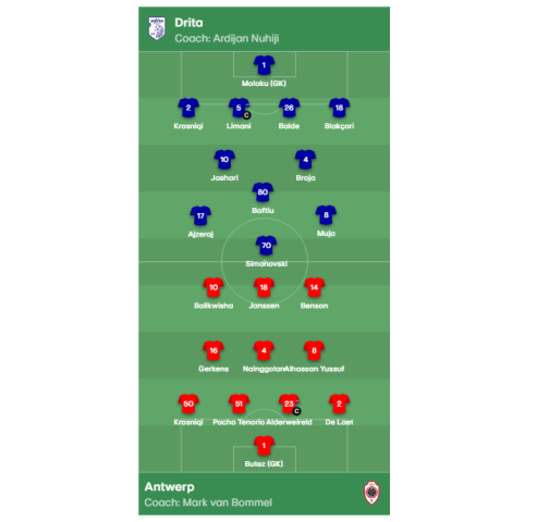 Më poshtë gjeni formacionet e plota për ndeshjen e sotme e cila do të zhvillohet në ora 20:00.