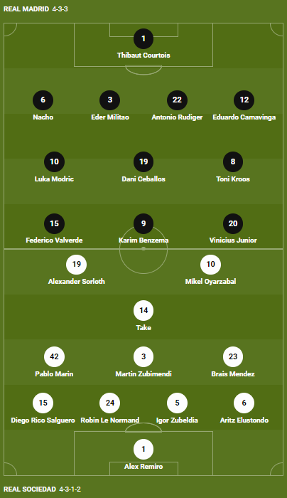 Përzgjedhja e lojtarëve që do të luajnë nga minuta e parë është bërë nga trajnerët Carlo Ancelotti dhe Imanol Alguacil.