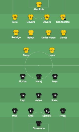 Nga porta do e nisë Strakosha, ndërsa mbrojtja është e përbërë nga Hysaj, Gjimshiti, Ajeti dhe Mitaj. Në mesfushë janë përzgjedhur Asllani, Shehu dhe Laçi më i avancuar, ndërsa në sulm, Broja dhe Hoxha, që cilësohet si surpriza e vetme e kësaj 11-she, do të mbështesin Rey Manajn në qendër.