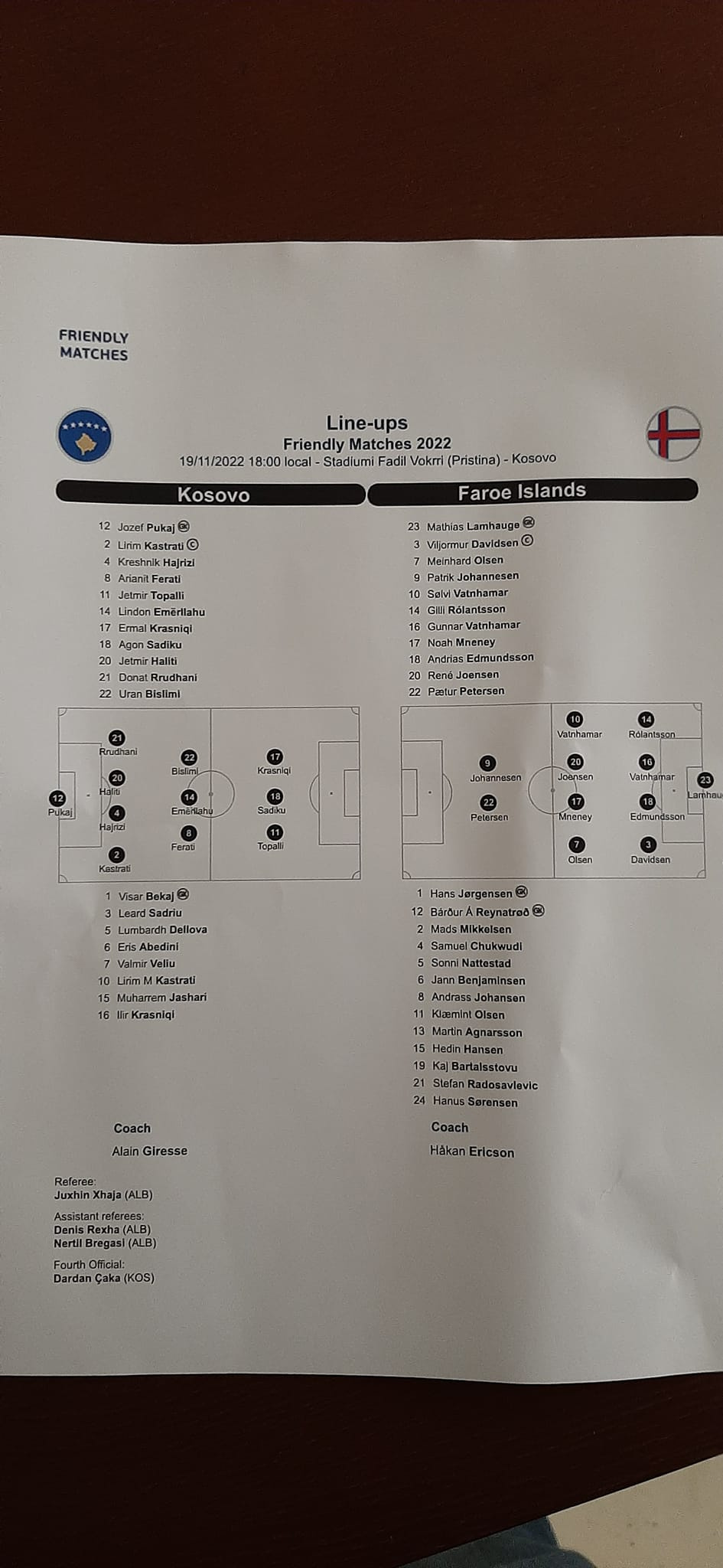Janë publikuar formacionet zyrtare të përfaqësues së Kosovës dhe të Ishujve Faroe për ndeshjen miqësore.