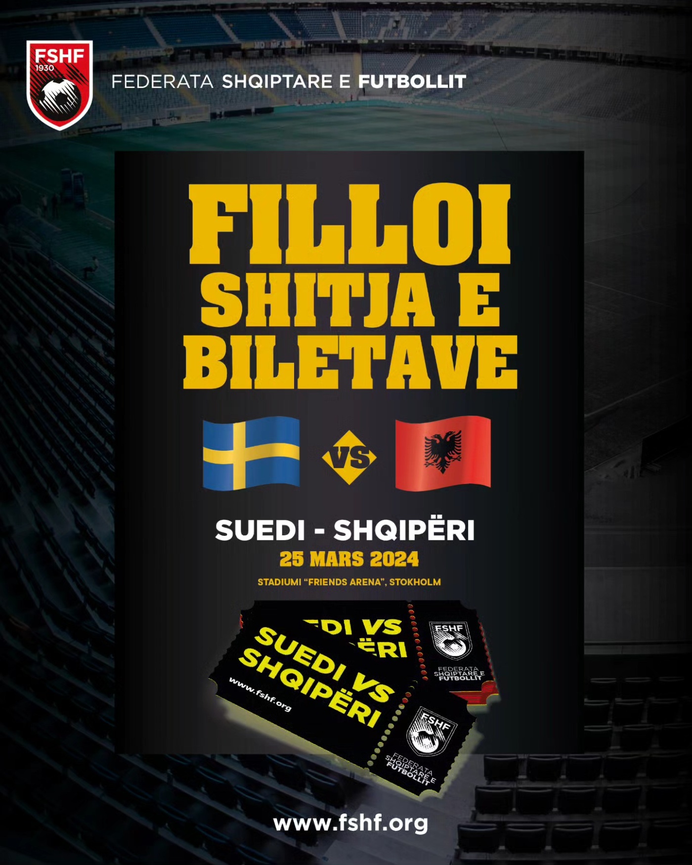 Federata Shqiptare e Futbollit njofton të gjithë tifozët e Kombëtares se kanë dalë sot në shitje biletat e ndeshjes miqësore Suedi – Shqipëri, që do të luhet më 25 mars në stadiumin “Friends Arena“ të Stokholmit në Suedi.