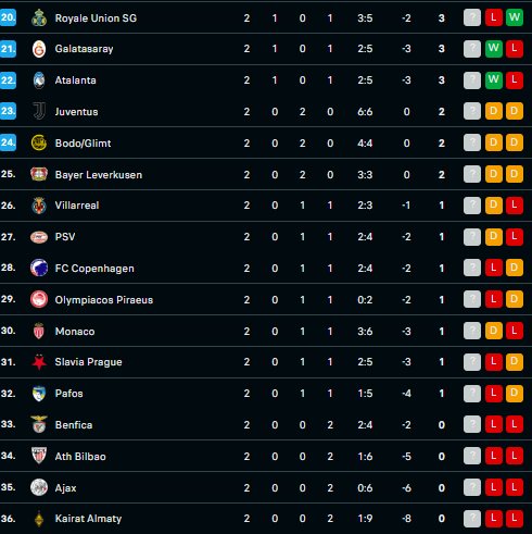 Ndërsa pa asnjë pikë pas dy xhirove janë Benfica, Athletic Bilbao, Ajaxi dhe Kairat Almaty.