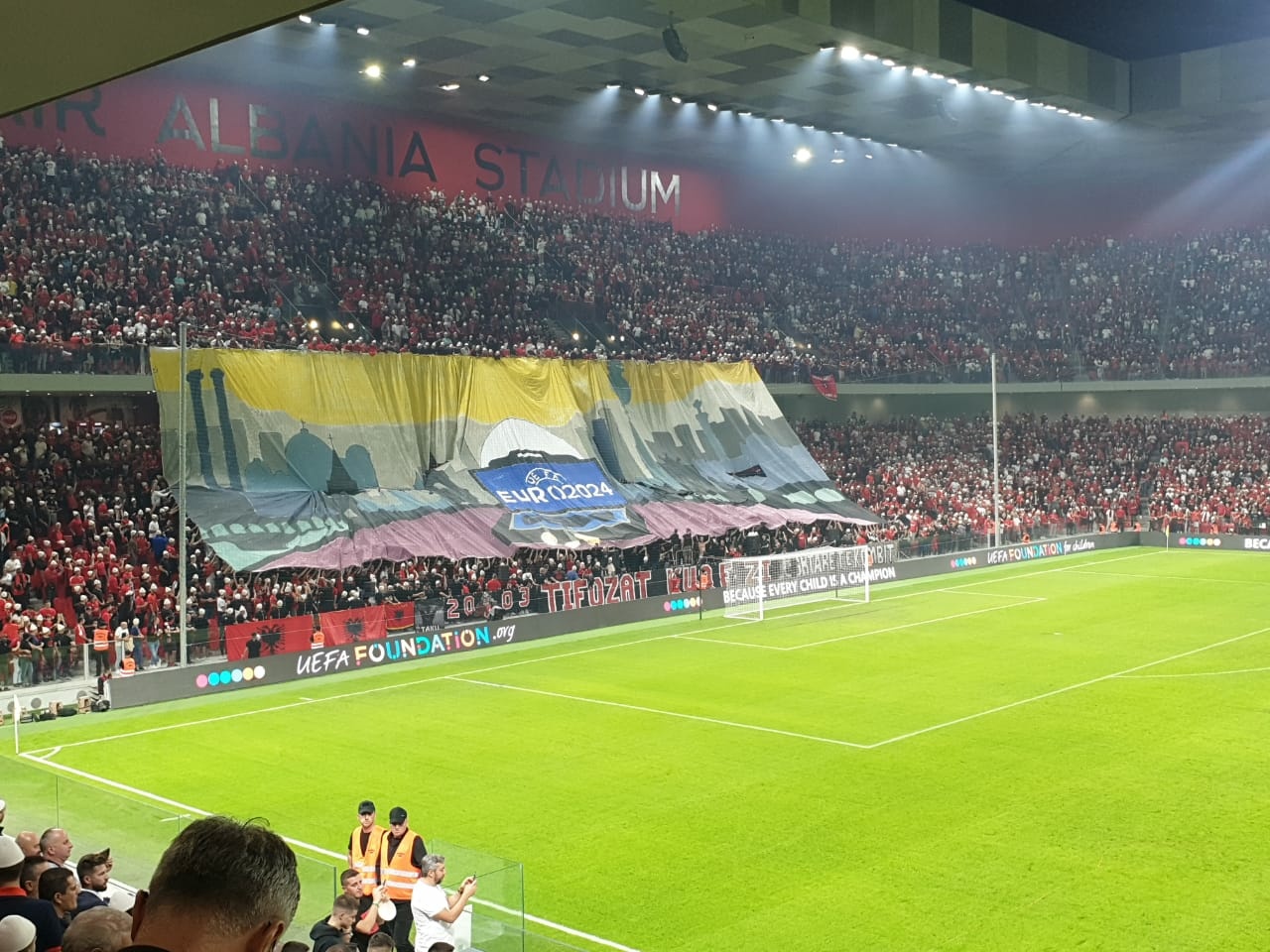 Atmosferë elektrizuese në shkallët e “Air Albania”-s, 22 mijë shqiptarë të pranishëm në mbështetje të Kombëtares, në duelin ndaj Çekisë. Një koreografi speciale u shpalos nga “Tifozat Kuq e Zi” në sektorin pas porte në momentin e startit të sfidës.