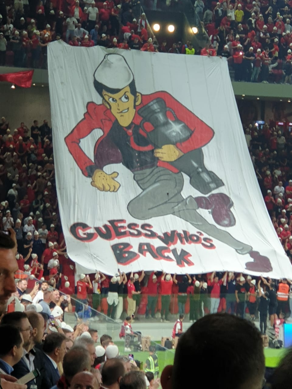 Mesazhi ishte i qartë, objektivi i vetëm është… Euro 2024, ku kuqezinjtë janë më pranë se kurrë. Në një koregrafi unike shfaqet “Hajduti” Lupin, një personazh i famshëm që njihet për vjedhjet e sendeve me vlerë. “Shikoni kush është kthyer”, shkruhet aty, ndërsa në foto është dikush me plis, me kupë në dorë./PANORAMASPORT.AL