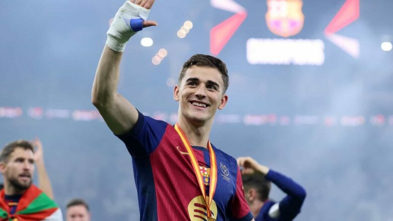 JEDDAH, SAUDI ARABIA - JANUARY 12: Gavi of FC Barcelona acknowledges the fans during the trophy presentation following the Spanish Super Cup Final between Real Madrid and FC Barcelona at King Abdullah Sports City on January 12, 2025 in Jeddah, Saudi Arabia. (Photo by Yasser Bakhsh/Getty Images)