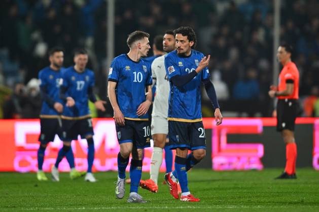 KOSOVO - ICELAND, UEFA Nations League 2025 Play-offs Emir Sahiti and Vesel Demaku of Kosovo in action during the UEFA Nations League 2025 Play-offs game between Kosovo - Iceland, stadium Fadil Vokkri, Pristina, Thursday March 20, 2025. Alex Nicodim/Imago Images Copyright: xAlexxNicodimx