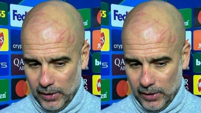 Guardiola doli në konferencë pas ndeshjes dhe menjëherë të gjithë vunë re gërvishtjet në kokën e tij. E gjithë koka i ishte gërvishtur, dhe gjaku në hundë binte në sy.