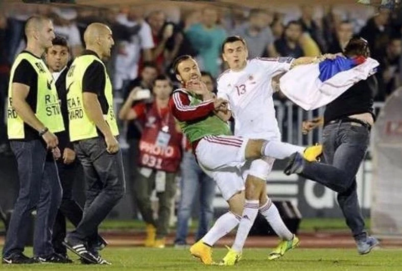 Në vitin 2014 në Beograd ndeshja mes Serbisë e Shqipërisë ishte ndërprerë që në pjesën e parë. Huliganët serbë, por edhe lojtarët dhe pjesëtarët e sigurisë kishin sulmuar lojtarët e Shqipërisë, pas shfaqjes së flamurit të famshëm me dron. Në fund ndeshja ishte regjistruar me rezultat 3:0 në të mirë të Shqipërisë, pas një procesi të gjatë.