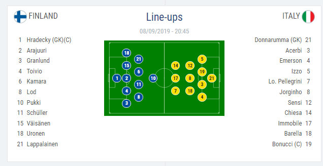 Janë publikuar formacionet zyrtare për sfidën mes Finlandës dhe Italisë.