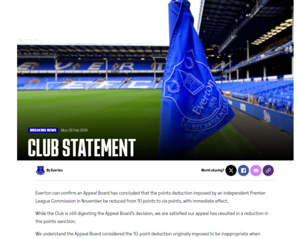 “Everton mund të konfirmojë që Bordi i Apelit ka arritur në përfundimin se zbritja e pikëve e vendosur nga një komision i pavarur i Premier League në nëntor të reduktohet nga 10 pikë në gjashtë pikë, me efekt të menjëhershëm.